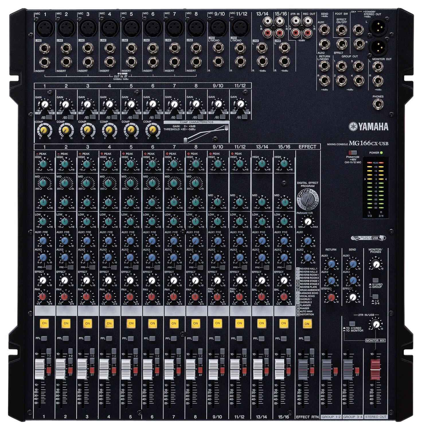 Le MG166CX USB est une console analogique à 16 voies, munie de beaucoup d’entrées avec une superbe qualité sonore. Elle est légère, robuste et de qualité haut de gamme. Le MG166CX dispose, comme presque toutes les tables Yamaha, d’un compresseur à touche unique intégré, ce qui facilite l’amplification du signal d’entrée.